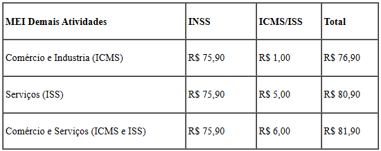 Os Microempreendedores Individuais (MEI) que exerçam as ocupações constantes da Tabela A do Anexo XI da Resolução CGSN nº 140/2018 terão os seguintes valores da Contribuição do MEI para o ano-calendário de 2025: