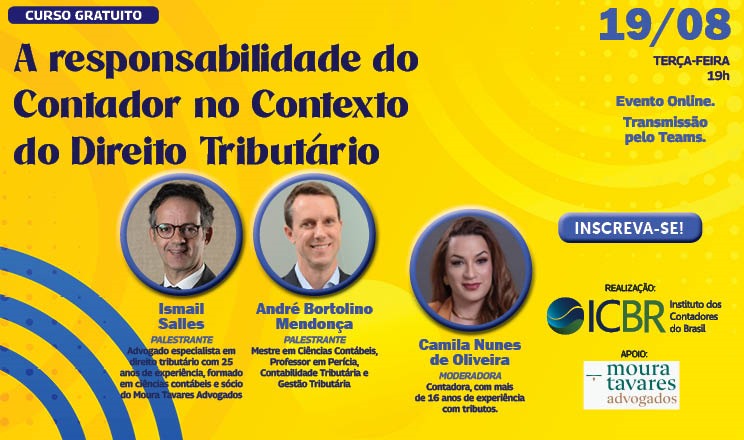 O evento, promovido pelo Instituto dos contadores do Brasil (ICBR), com apoio da Moura Tavares Advogados, será conduzido por Ismail Antonio Vieira Salles, contador e advogado; André Bortolino de Mendonça, contador, perito, tributarista e advogado; e moderado por Camila Oliveira, Contadora e tributarista com mais de 16 anos de experiência. os interessados na participação presencial, é necessário realizar a inscrição normalmente pelo link e, depois, solicitar a vaga por e-mail conforme orientação na confirmação da inscrição.
