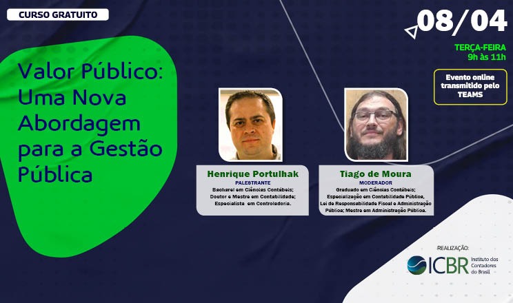 Discutir a nova perspectiva sobre o desempenho do setor público, que toma o valor percebido pelo cidadão e pela sociedade como direcionador da gestão pública contemporânea, esse é o objetivo do curso Valor Público: Uma Nova Abordagem para a Gestão Pública, a ser realizado pelo Instituto dos Contadores do Brasil (ICBR), no dia 8 de abril de 2025, das 9 às 11 horas, com a participação do professor Henrique Portulhak e mediação de Tiago de Moura.