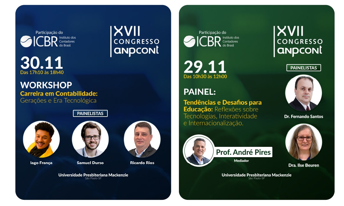 O Instituto dos Contadores do Brasil (ICBR) é um dos patrocinadores do XVII Congresso Anpcont, organizado pela Associação Nacional de Programas de Pós-Graduação em Ciências Contábeis (Anpcont) e será responsável por dois eventos dentro da programação, o Painel Tendências e Desafios para Educação: Reflexões sobre Tecnologias, Interatividade e Internacionalização e o Workshop Carreira em Contabilidade: Gerações e Era Tecnológica. O evento, que neste ano será realizado entre os dias 29 e 01 de dezembro, em São Paulo, na Universidade Presbiteriana Mackenzie. O congresso proporciona a interação da comunidade acadêmica, com a divulgação da produção técnico-científica de pesquisadores, professores e estudantes dos cursos de pós-graduação de ciências contábeis.