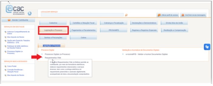 O requerimento deverá ser efetuado mediante abertura de processo digital no Portal do Centro Virtual de Atendimento - Portal e-CAC, na aba "Legislação e Processo", por meio do serviço "Requerimentos Web", acessível nos termos da IN RFB nº 2.066, de 24 de fevereiro de 2022, e disponível no site da RFB na Internet, conforme tela abaixo: