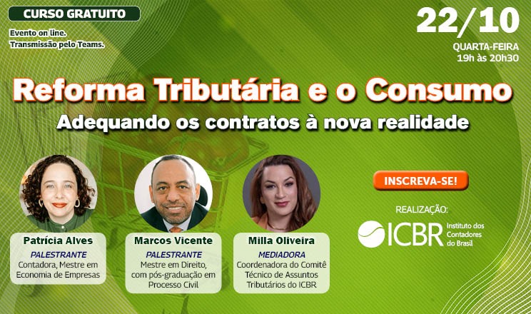 Evento online, promovido pelo ICBR, em 22 de outubro de 2025, à 19 horas, discutirá como as mudanças na legislação tributária exigem ajustes nos contratos empresariais, com foco nos riscos, oportunidades e práticas para adequação. Transmissão pela Plataforma Teams.